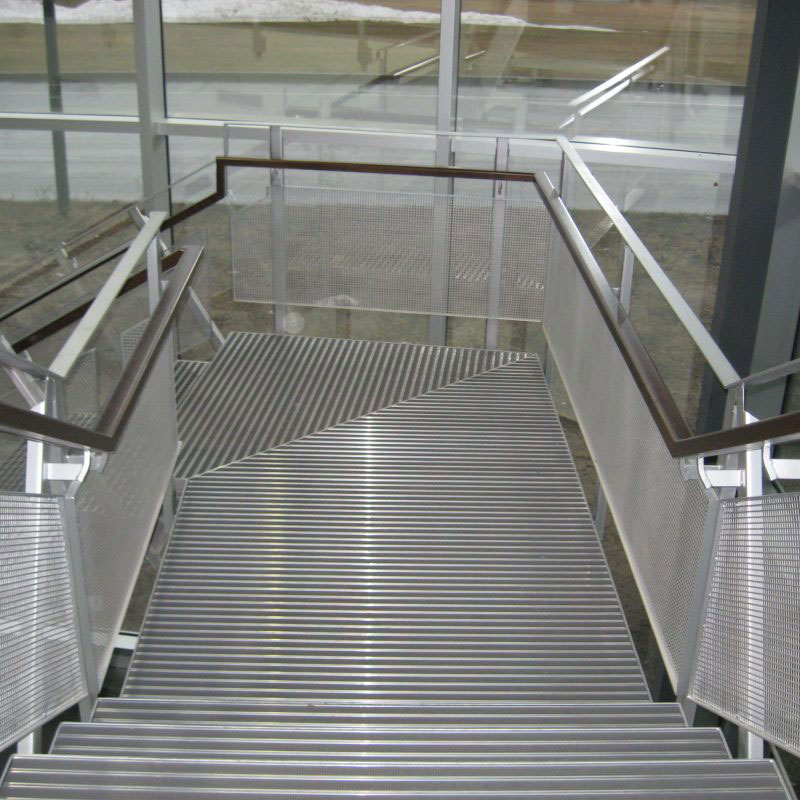 The aluminum foot grille blades come with a carpet insert followed by a rectangular vinyl insert. The carpet and vinyl inserts are inserted so as to be interchangeable and are designed to be both esthetically pleasing and efficient. The bands are locked at each end for safety.